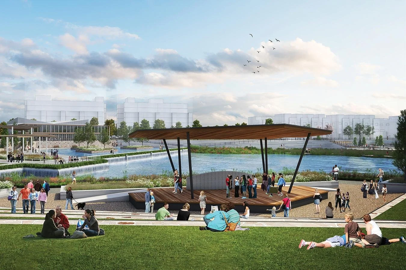 With water as a unifying design element, the dynamic urban living room blends 365-day-a-year people-oriented programming with a multitude of park features far exceeding conventional public park investment.