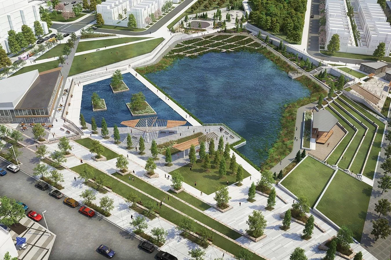 Radio Park is an award-winning public space at the heart of the West District Master Plan. Fully integrated with residential and commercial uses flanking all sides, and sized at a generous 8.4 acres, it serves not only as a local gathering space, but also as a city-wide destination.